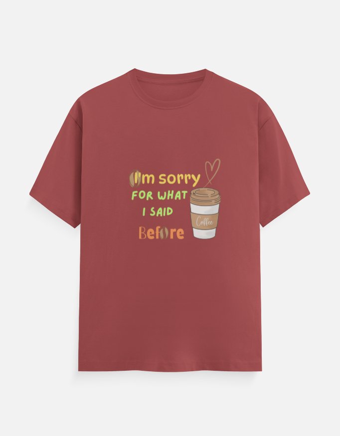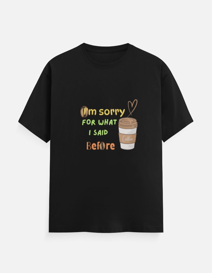 Fun black graphic tee featuring a cute coffee cup and the playful quote “I’m sorry for what I said before coffee,” perfect for caffeine-fueled personalities. Ideal for coffee lovers who want to add humor and attitude to their everyday casual wardrobe
