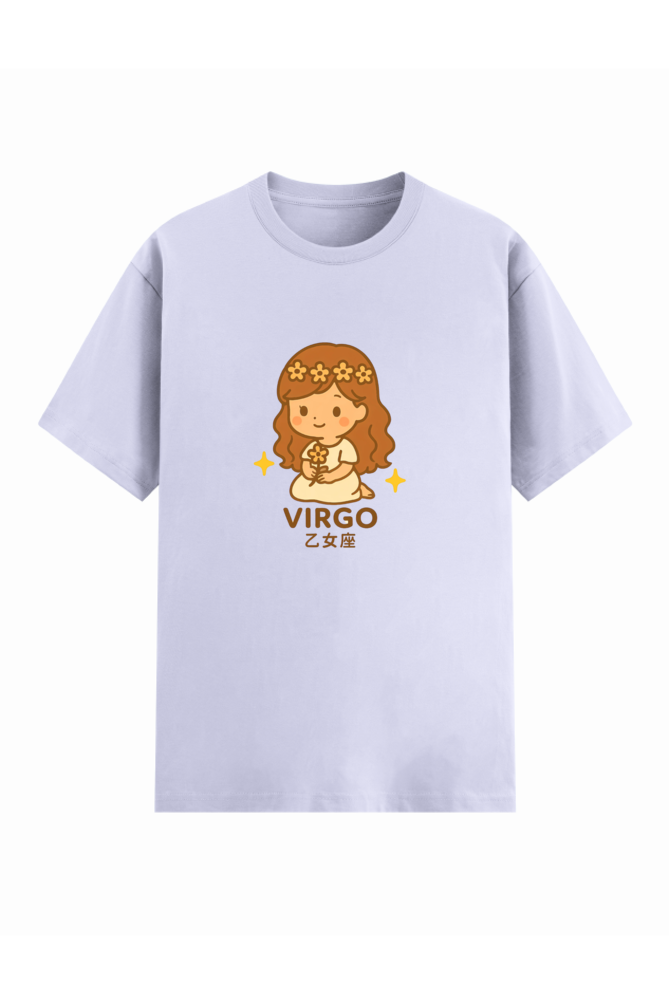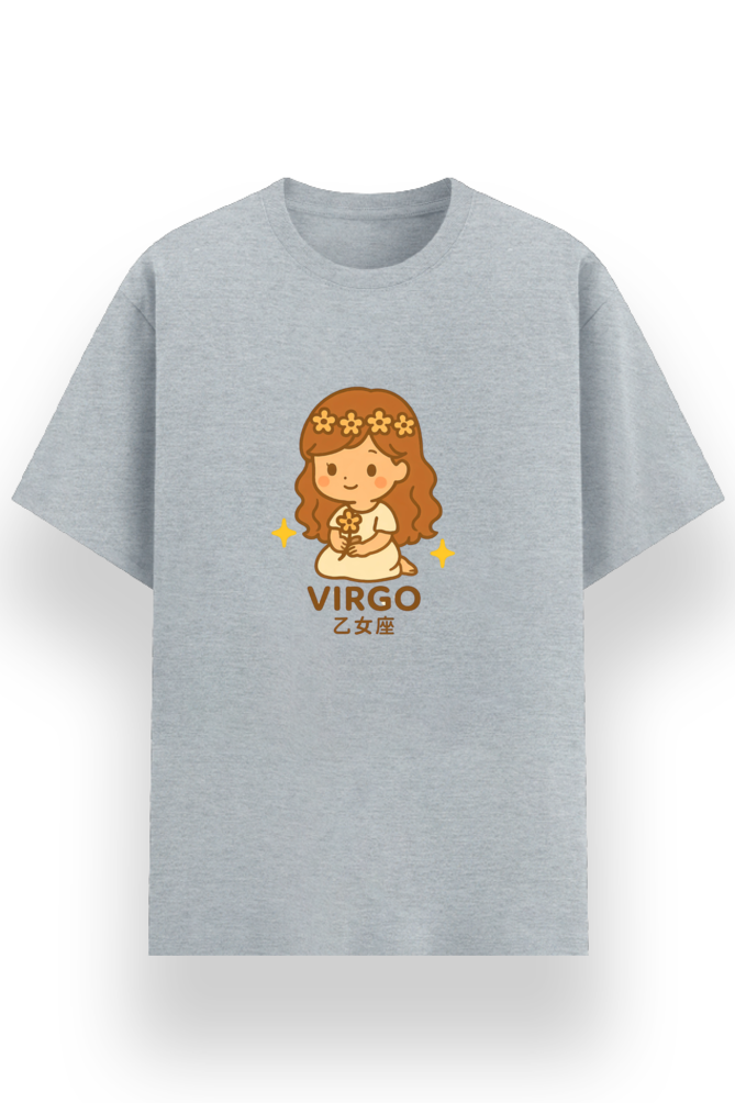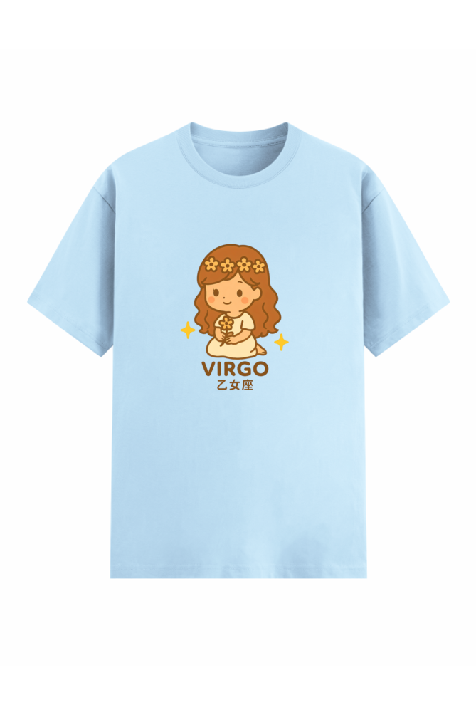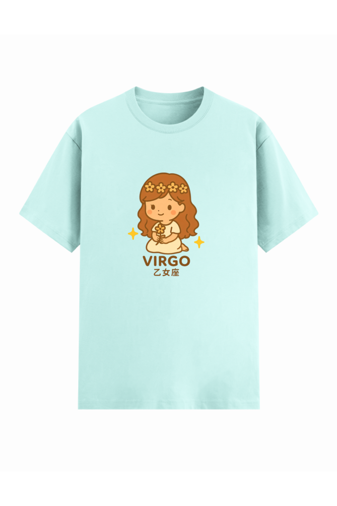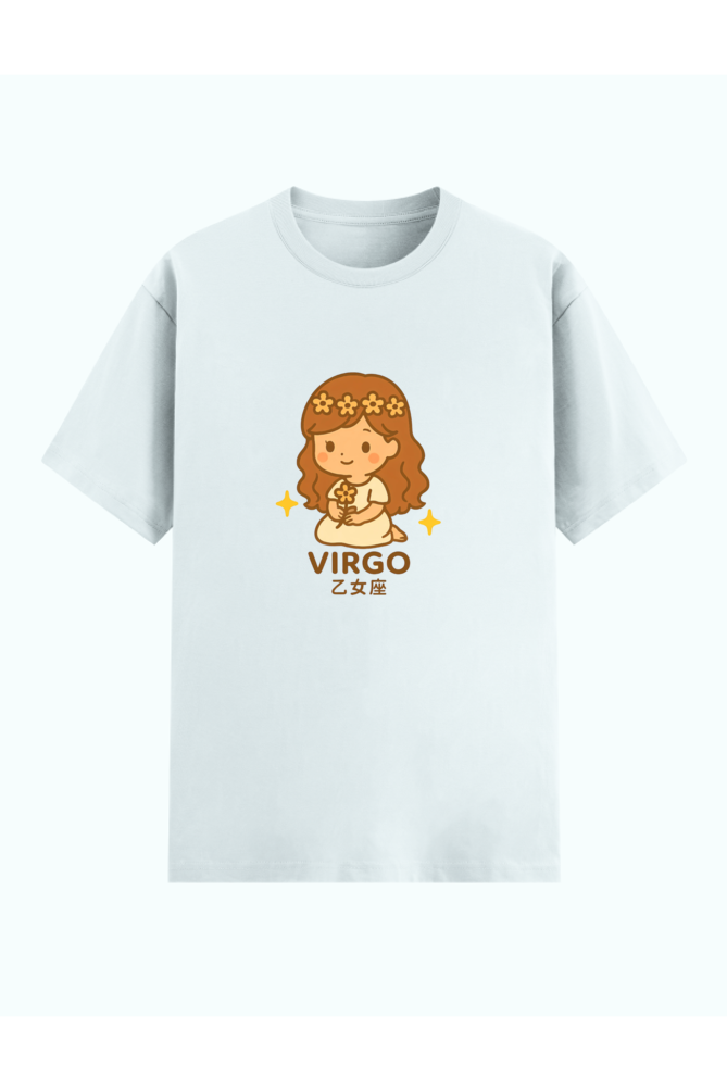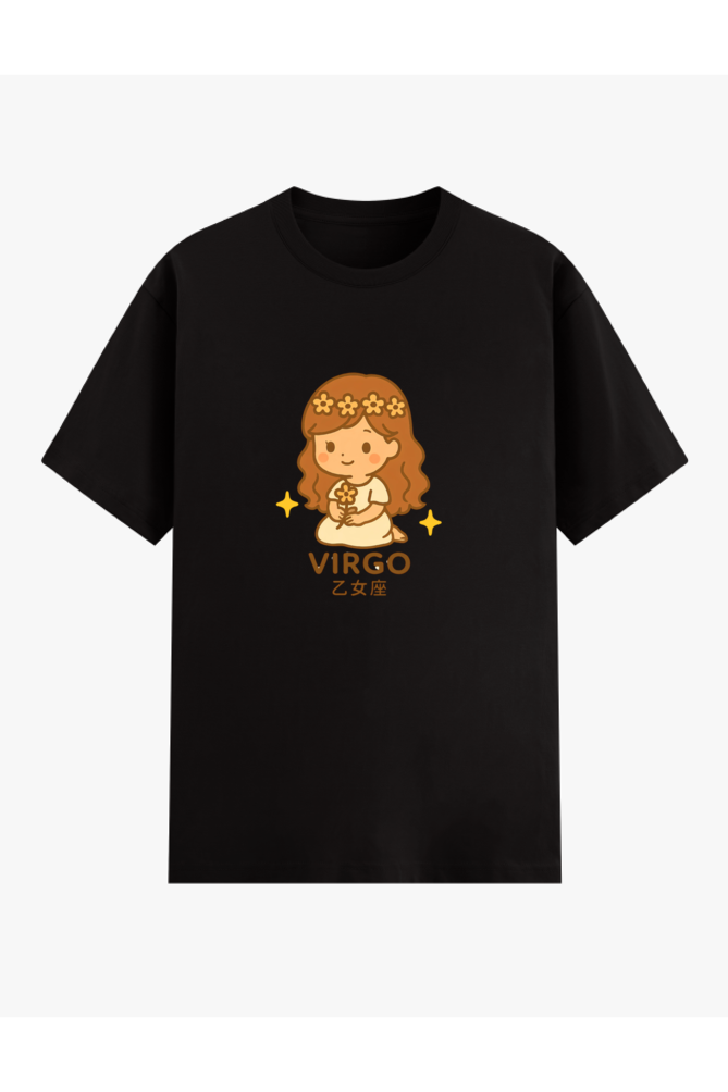 Express your Virgo spirit in style with this eye-catching black graphic t-shirt! Featuring an adorable cartoon illustration of the Virgo zodiac sign, accented by vibrant floral details and sparkling golden stars, this tee is a must-have for astrology lovers and proud Virgos alike.